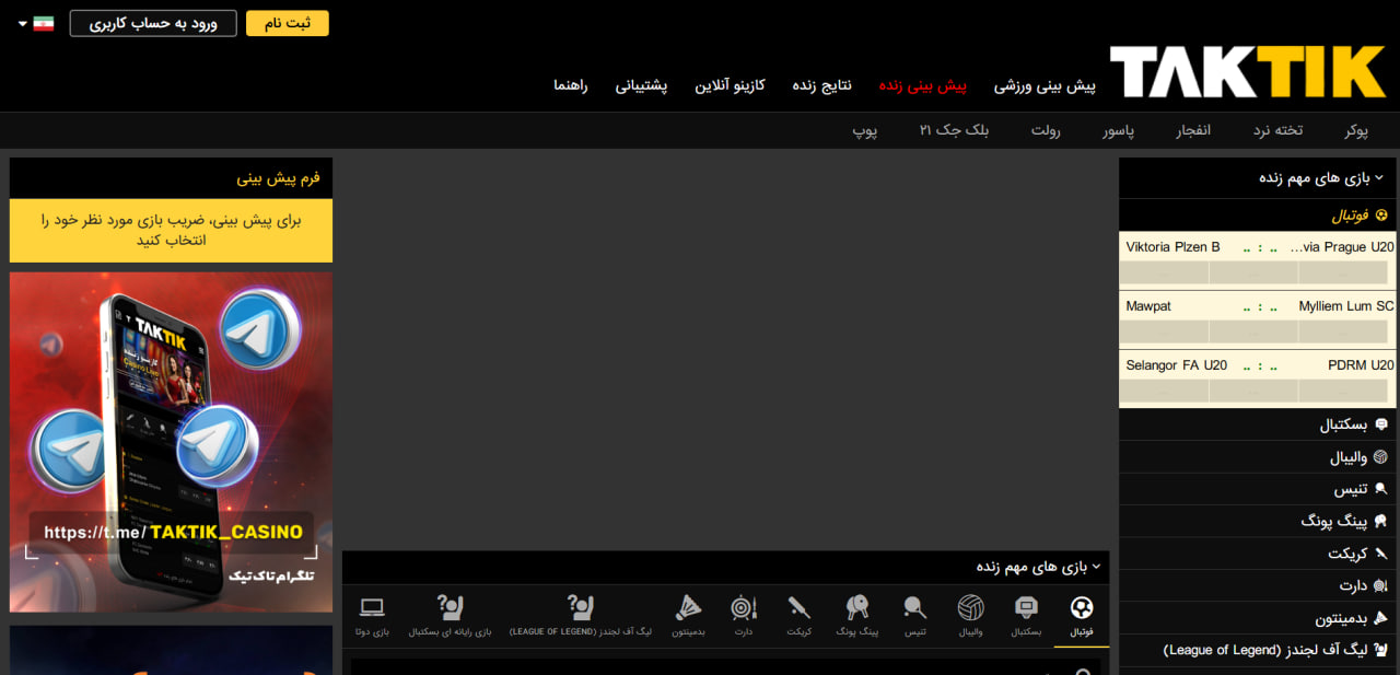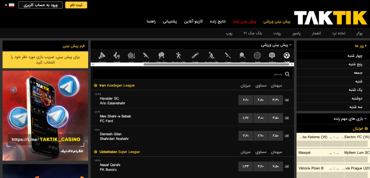 انواع فرم های شرط بندی: از شرط بندی ساده تا فرم های ترکیبی و سیستمی در دسترس است تا کاربران بتوانند استراتژی های مختلف را اجرا کنند. - ضریب های رقابتی: تاک تیک بت ضریب های جذاب و بالایی ارائه می دهد که سود کاربران را افزایش می دهد.