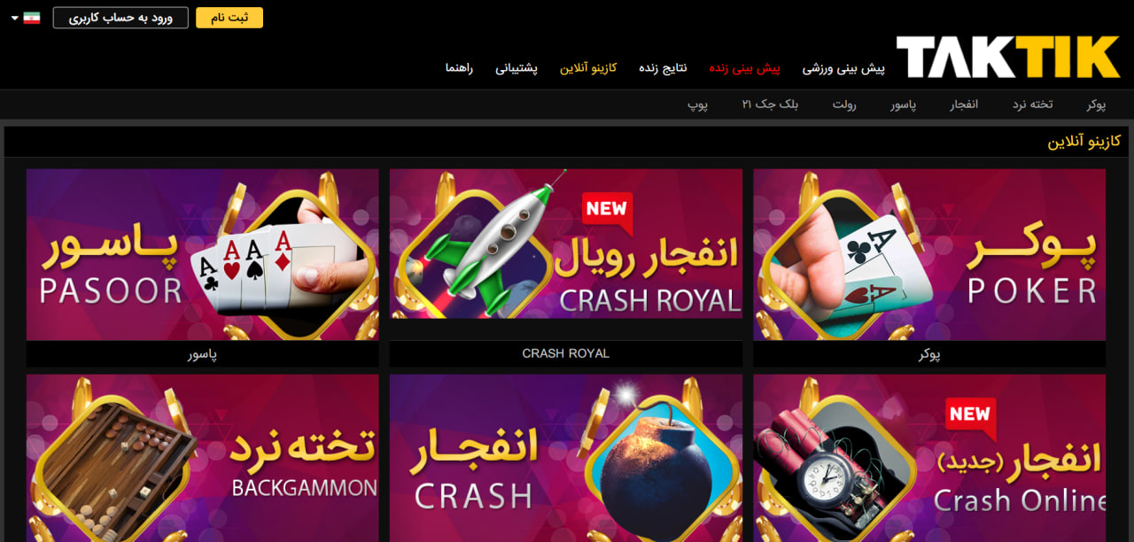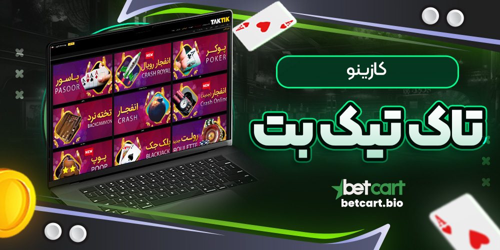 کازینو تاک تیک بت یکی از محبوب ترین بخش های این سایت معتبر است که تجربه بازی آنلاین را به سطح حرفه ای می رساند. در کازینو تاک تیک بت انواع بازی های کلاسیک و مدرن در دسترس کاربران قرار دارد تا هر کاربری با هر سلیقه ای بتواند سرگرم شود. این بخش به گونه ای طراحی شده است که هم مبتدیان و هم حرفه ای ها بتوانند به راحتی بازی کنند و شانس خود را برای برنده شدن امتحان کنند.